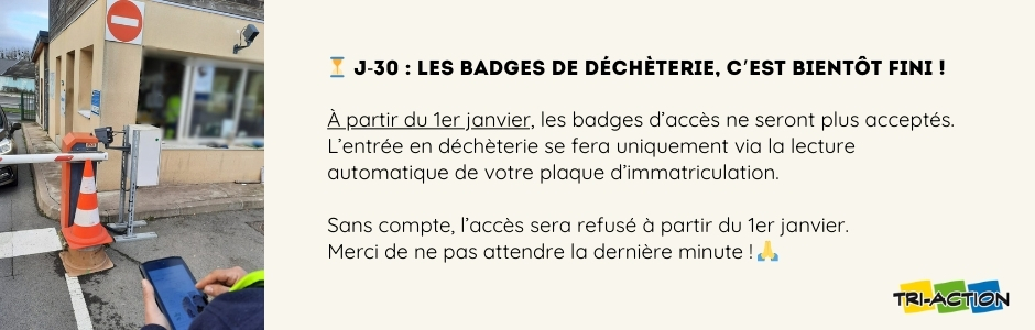 À partir du 1er janvier, les badges d’accès ne seront plus acceptés.L’entrée en déchèterie se fera uniquement via la lecture automatique de votre plaque d’immatriculation.